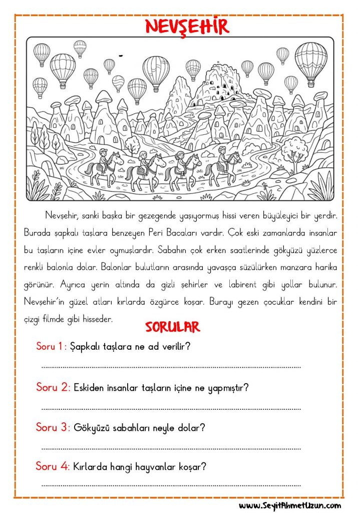 Yeni formatta ve çocuklar için özgün olarak hazırladığım Okuma Anlama Metni – Nevşehir beğenilerinize sunuyorum. Bu etkinlikte oluşturulan metinde soruların cevabını bulma amaçlanmıştır. Metni 3 kere okuduktan sonra soruları kolayca cevaplayabilirsiniz. Yorumlarınızı ve görüşlerinizi belirterek bizlere destek olabilirsiniz.